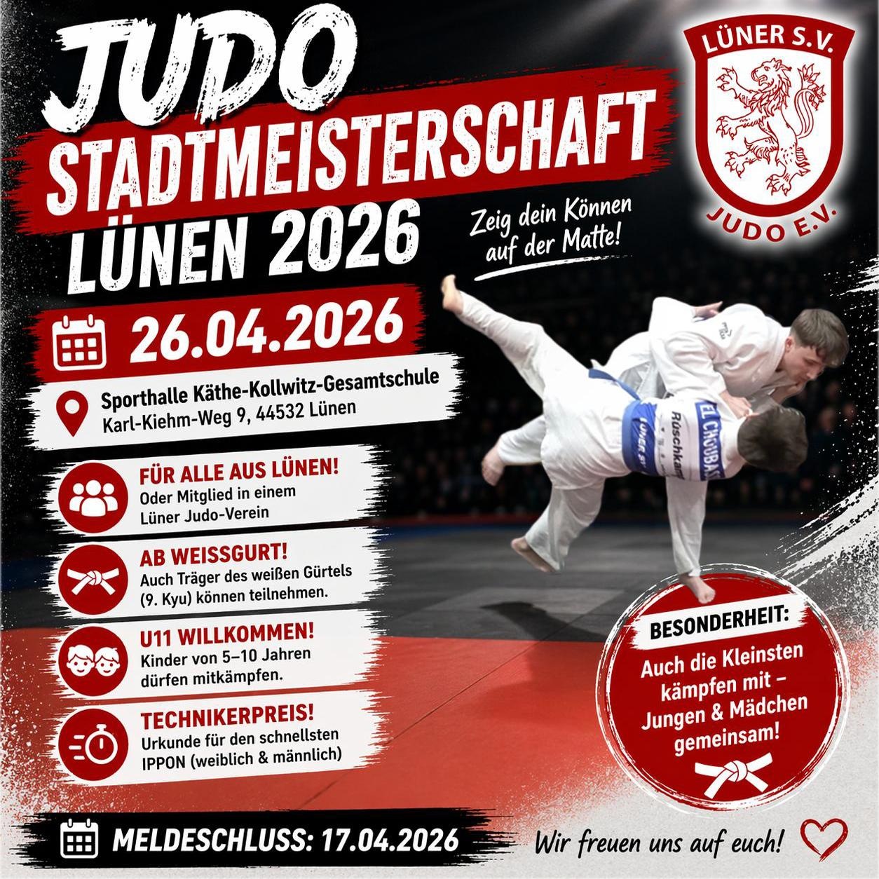 Einladung zur Jahreshauptversammlung Hallo Judokas, hallo Eltern, hiermit möchten wir Euch recht herzlich zur Jahreshauptversammlung 2026 des LSV-Judo einladen. Sie findet am 29.01.2026 um 18:00 Uhr in der Turnhalle der Käthe-Kollwitz-Gesamtschule, Karl-Kiehm-Weg 9 44532... Read more