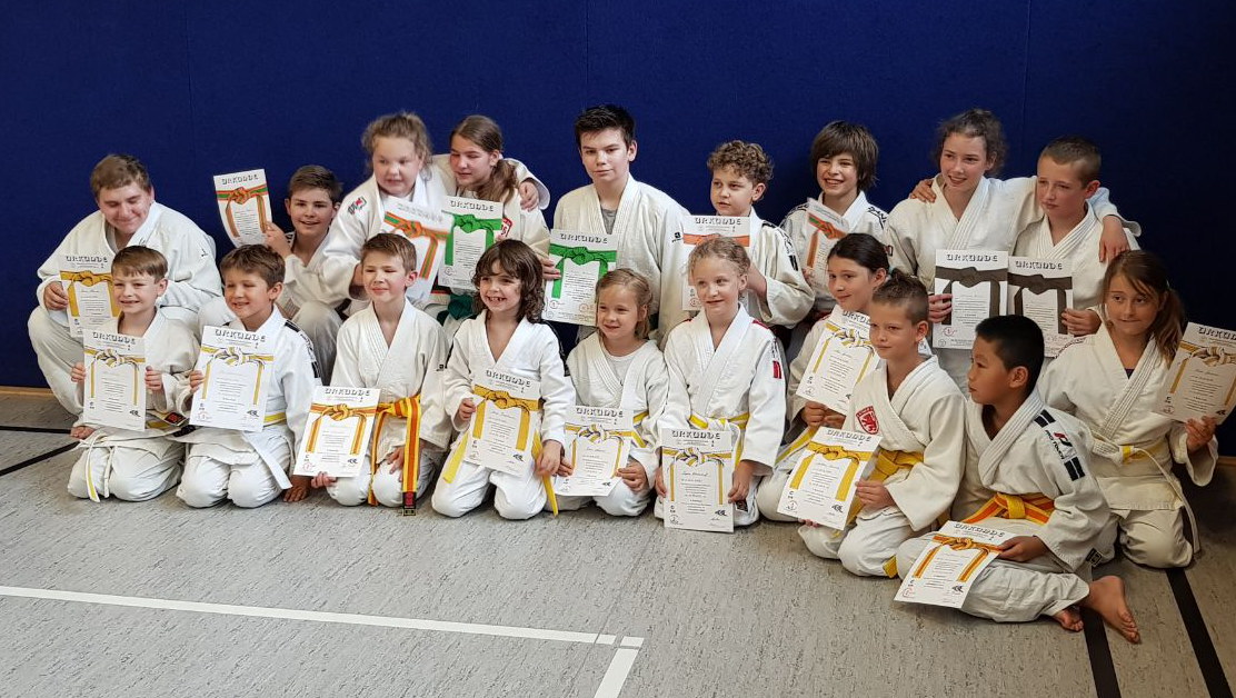 19 Mädchen und Jungen nahmen hieran teil. Alle hatten sich zuvor in zahlreichen Übungsstunden gut vorbereitet. Sie mussten u.a. Würfe, Haltegriffe, Armhebel und die Kata ab dem grünen Gürtel zeigen.