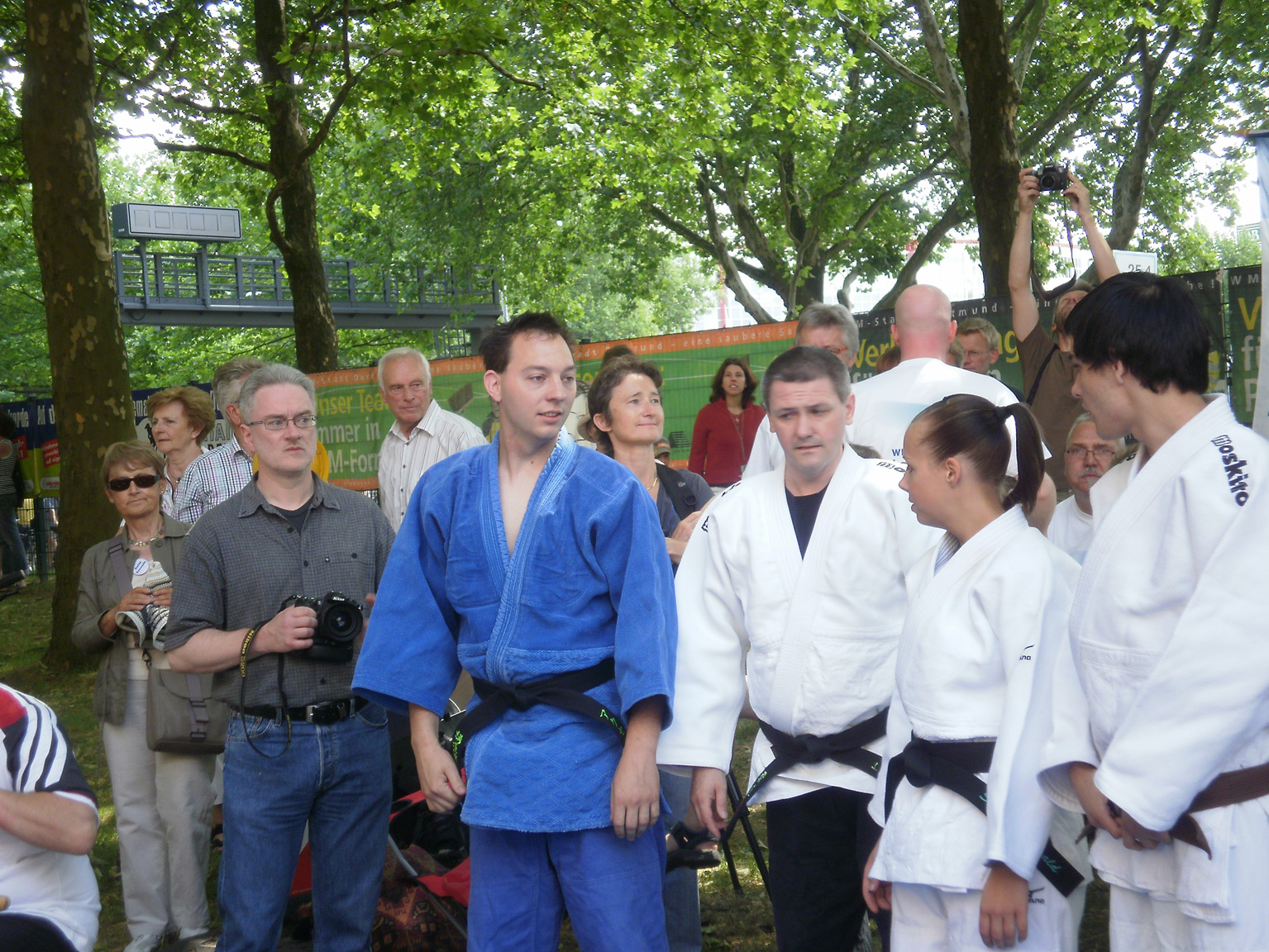 Zunächst gab es das Problem, bei den vielen Fußgängern und Radfahrern, die sich auf der normalerweise meistbefahrenen Autostraße Deutschlands bewegten, Platz für die Matten zu finden. Aber die Judomütter sorgten resolut dafür. Alles mußte schnell gehen. Dann konnten endlich die Judo-Mädchen und Jungen unter der Leitung ihrer Trainer Jörg Schönfeld und Axel Hadac ihr Können zeigen.