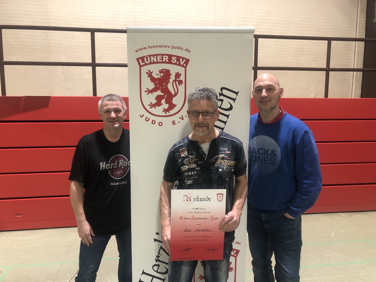 Foto: Lars Arnhölter (Mitte) hält seit nunmehr 45 Jahren dem LSV Judo die Treue. Glückwünsche dafür gab es von den beiden Vorsitzenden Jörg Schönfeld (l.) und Axel Hadac (r.)