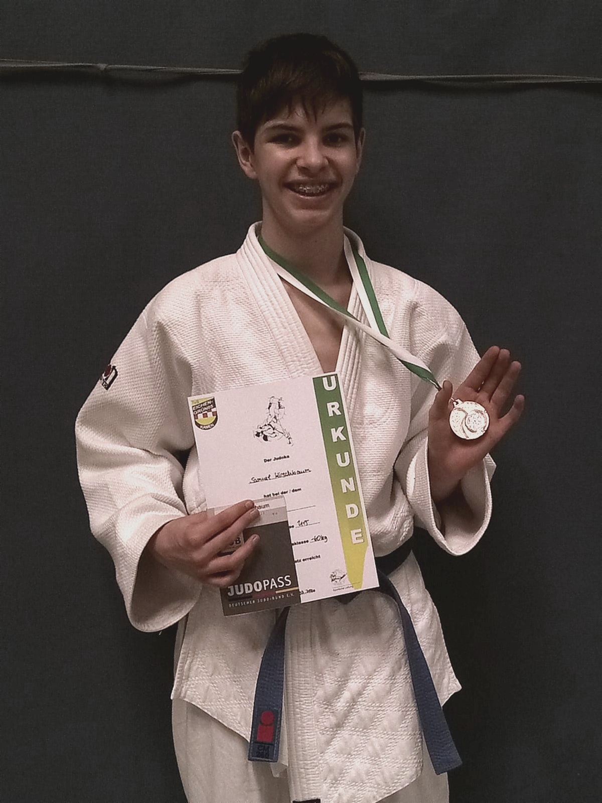 Auch Samuel Kirschbaum erreichte das Finale in der U 15 bis 60 kg. In der Vorrunde zeigte er, dass er in Form war, als er zunächst mit einer Außensichel gewann und seinen nächsten Gegner mit einem Uchi-mata, einem inneren Schenkelwurf, warf. Nach einem weiteren Sieg stand er im Endkampf. Diesmal musste er sich aber gegen einen starken Kontrahenten aus Witten geschlagen geben, so dass „nur“ der zweite Platz heraussprang.